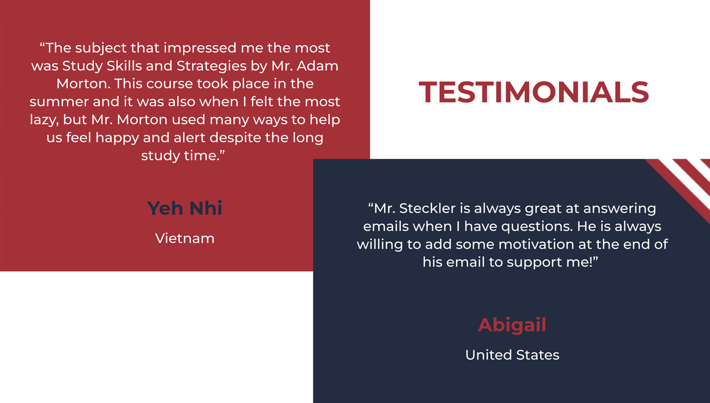 “The subject that impressed me the most was Study Skills and Strategies by Mr. Adam Morton. This course took place in the summer and it was also when I felt the most lazy, but Mr. Morton used many ways to help us feel happy and alert despite the long study time.”